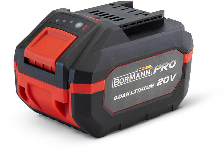 BORMANN 20V Li-Ion 6 Ah akkumulátor Különösen nagy igénybevételű szerszámokhoz készült, amelyek hosszabb üzemidőt igényelnek, és energiajelző fénnyel van felszerelve, amely lehetővé teszi a fennmaradó energia megfigyelését. Kompatibilis a BORMANN Pro 20-Volt akkumulátorok teljes választékával. Akkumulátor típusa/töltő: Li-Ion
