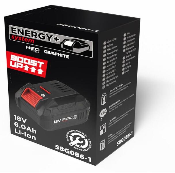 GRAPHITE 58G086-1 AKKUMULÁTOR ENERGY+ RENDSZERHEZ, 18V/6AH, BOOST UP. A lítium-ion akkumulátor 21700 tip. cellát használ, kiegyensúlyozott áramrendszerrel és Sleep System funkcióval rendelkezik. A BOOST UP az akkumulátorok új generációja a legigényesebbek számára. Alkalmas a GRAPHITE és NEO TOOLS márkák Energy+ sorozatának vezeték nélküli termékeihez.