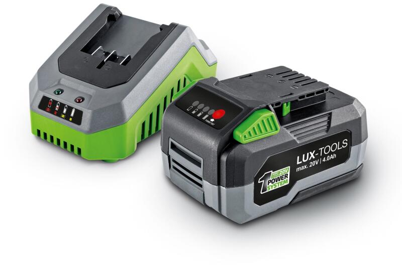 LUX-TOOLS LUX 1 PowerSystem kezdőkészlet 20 V 4 Ah Li-Ion akkumulátorral és gyorstöltővel (196034)