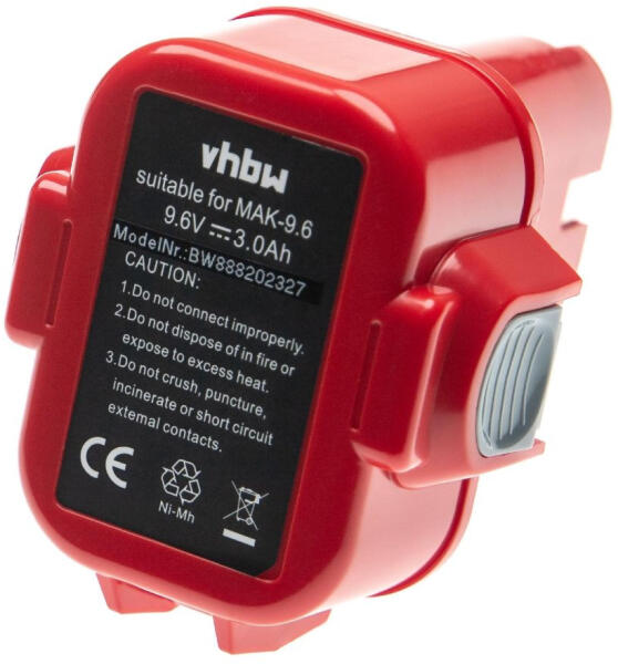 Gyártó: VHBW; Szín: piros; Méretek (H x Sz x Ma): 10,3 x 8,7 x 7,8 cm; Technológia: NiMH; Kapacitás: 3000 mAh; Feszültség: 9,6 V; Névleges energia: 28,8 Wh; Cellák száma: 8; Szállítás tartalma: 1x akkumulátor Kompatibilis eszközök: Makita 6207D, Makita 6207DWDE, Makita 6222D, Makita 6222DE, Makita 6222DWE, Makita 6226D, Makita 6226DW, Makita 6226DWBE, Makita 6226DWE, Makita 6260D, Makita 6260DWE, Makita 6260DWPE, Makita 6261D, Makita 6261DWPE, Makita 6503D, Makita 6503DWA, Makita 6503DWAE, Makita 6503DWD, Makita 6503DWDE, Makita 6503DWF, Makita 6503DWFE, Makita 6908D, Makita 6908DA, Makita 6908DWA, Makita 6908DWAE, Makita 6908DWDE, Makita 6909D, Makita 6909DW, Makita 6909DWA, Makita 6909DWAE, Makita 6909DWDE, Makita 6990D, Makita 6990DWA, Makita 6990DWAE, Makita 6990DWD, Makita 6990DWDE, Makita 6990DWF, Makita 6990DWFE, Makita 6991D, Makita 6991DWDE, Makita 6992D, Makita 6992DWDE, Makita BMR100, Makita DA392D, Makita DA392DW, Makita DA392DWA, Makita DA392DWD, Makita DA392DWF, Makita DA392DZ, Makita ML903 Makita 9120, Makita 9122, Makita 9133, Makita 9134, Makita 9135, Makita 9135A, Makita 192595-8, Makita 192596-6, Makita 192638-6, Makita 192697-A, Makita 193058-7, Makita 193099-3, Makita 193156-7, Makita 193977-7, Makita 638344-4-2, Makita ML9120